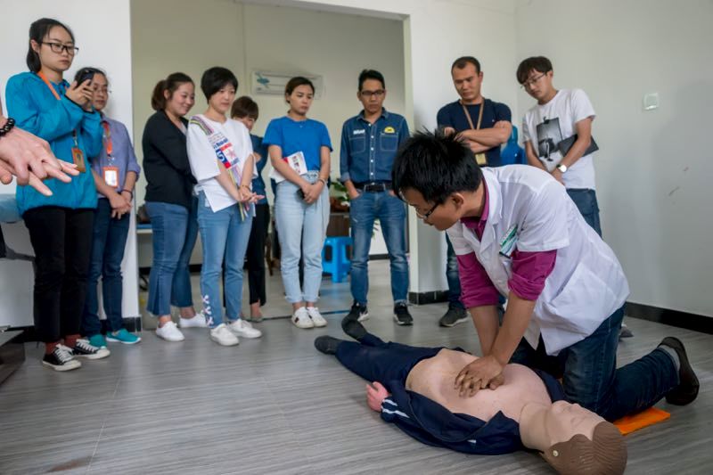 启动仪式结束后,由省红十字一级救护培训师戴远波为产业区160余名工作人员授课。此次培训主要采取理论知识教学与实际操作相结合的授课模式,培训课上,戴远波老师向学员们介绍了红十字会运动的基本知识,详细地讲解了心肺复苏、除颤仪的操作、气道异物梗塞的急救等知识,并利用人体模型进行了现场示范,将理论讲解与实物操作相结合,增强了培训的实效性。此次培训分为集中式大班制急救理论知识学习、分批次一对一小班化实操训练、考试考核等逐步展开,考试与考核均合格者将获得《中国红十字会急护员》证书。
