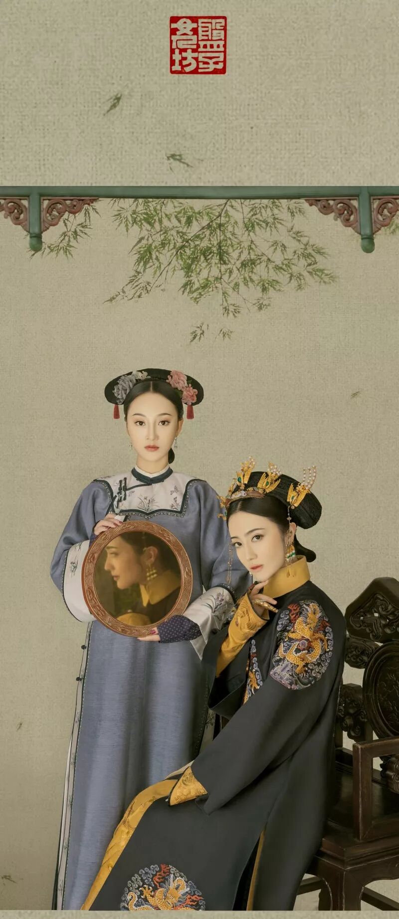主题营造出如同长春宫内庭院一般的环境,烘托两位人物的情感互动,呈现温馨怡然的氛围。画面中,富察皇后身着吉服,端坐木椅,典雅大方。温柔垂视的动作,展现皇后对璎珞的宠爱与包容。璎珞则促膝而坐、持镜而妆,表达出对皇后的亲近与依赖。