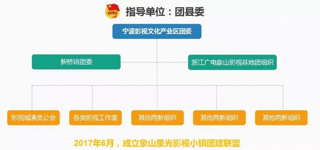 在象山星光影视小镇中,目前有35周岁以下青年,916人,团员531人,主要是影视拍摄青年410人,演艺表演青年34人,落户企业青年322人,本地青年150人。为更好的服务这类新兴群体,在团县委的指导下,前期已成立星光影视特色小镇团建联盟,通过打造实体阵地“象漂”青年之家,联合小镇其他单位力量,共同助力“象漂”成长。而随着小镇被推为市级群团改革试点,团建联盟主动发力,实施星光“筑梦计划”,积极推进特色小镇团建工作,推动群团改革在基层落地生根。