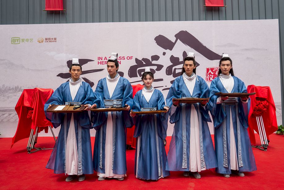 4月23日,《云上学堂》在象山影视城正式开机并进入拍摄,剧组工作人员和主演都悉数亮相,主演们的另类扮相更是相当亮眼。由鞠婧祎、宋威龙、毕雯珺、王瑞昌四位共同组成的“云上四杰”齐齐亮相于发布会现场,四个人都是一身古代书生的装扮,四位“帅哥”齐聚一堂,那颜值可是相当养眼啊!