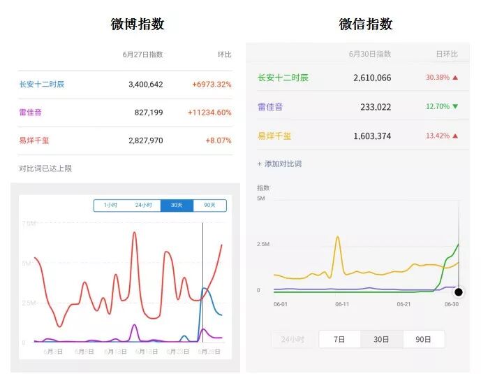 从媒体指数变化来看,在优酷平台突然“裸播”的《长安十二时辰》前期宣传不足,剧集的媒体指数远不如雷佳音和易烊千玺两位主演。