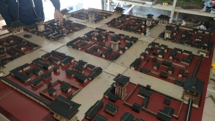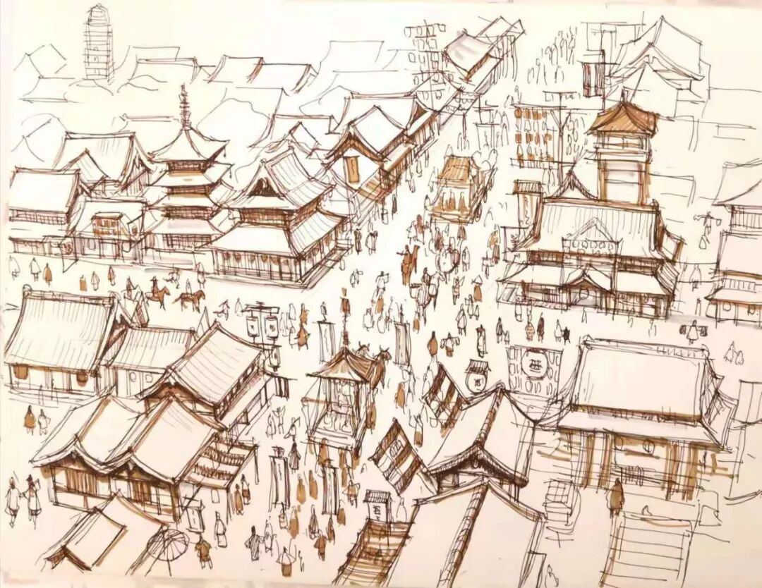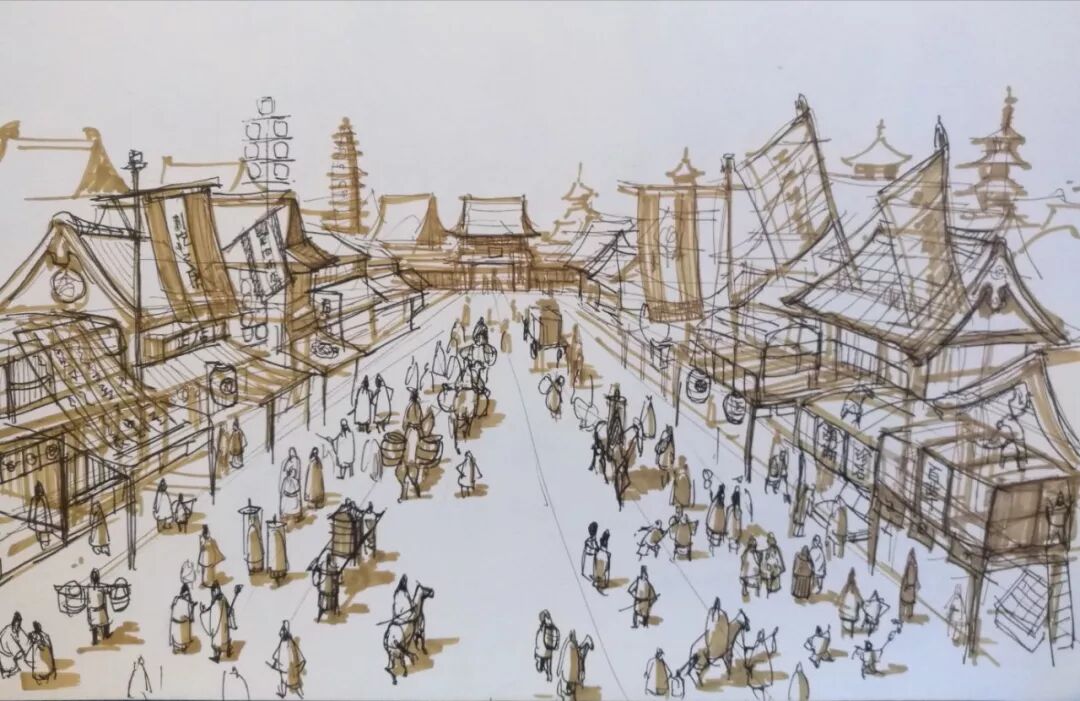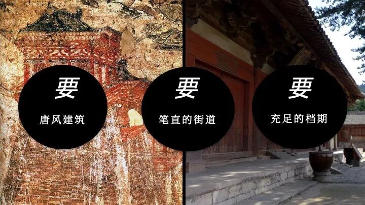 我们想象的长安是什么样子,需要先在纸上实现。画的时候我们想:这些东西怎么去实现呢?我们要找一个场地,找一个很大的地方,于是我们开始了我们的海选。我们提的要求非常简单,就三点:要有唐风的建筑;要有笔直的街道;还要有充足的档期。