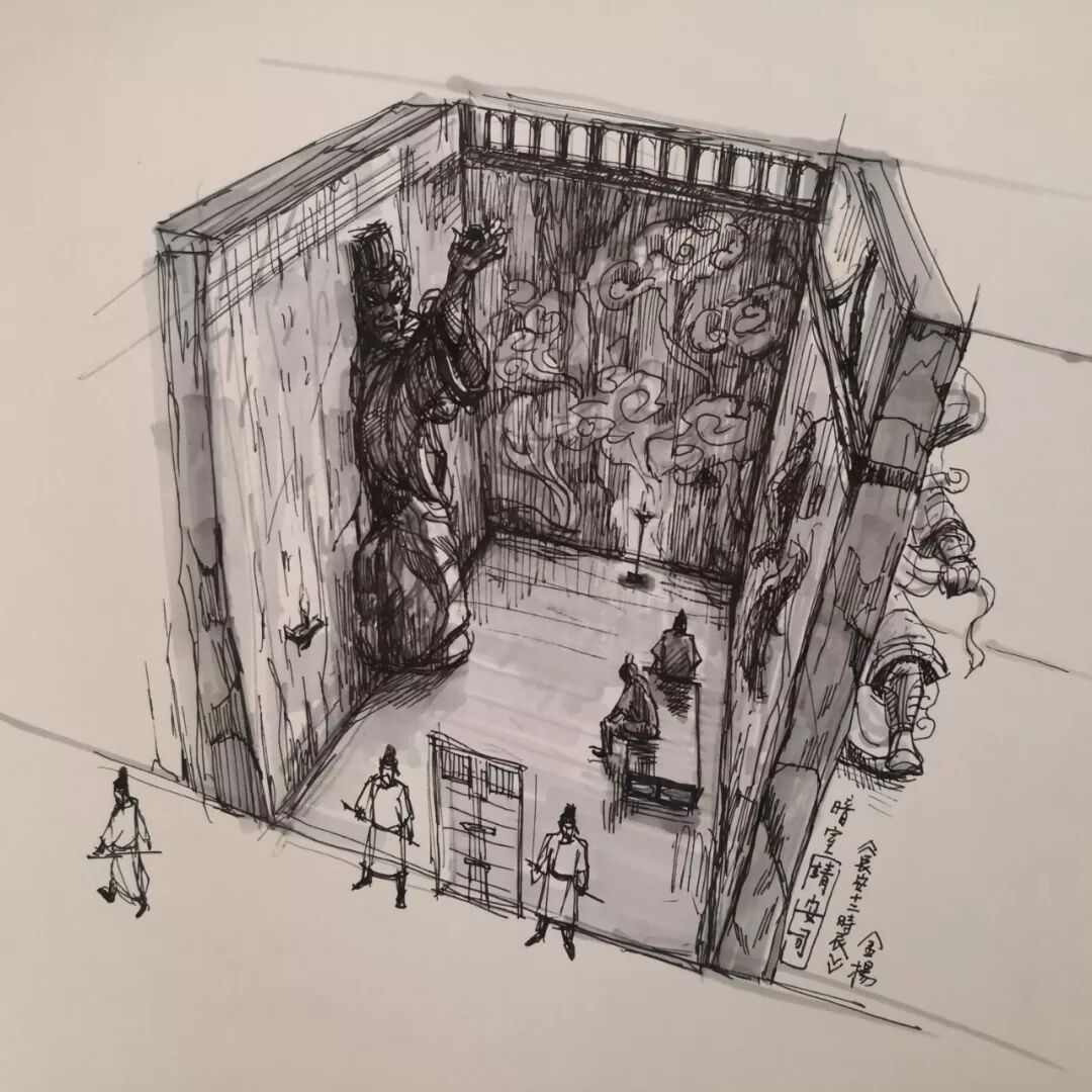 这是靖安司里面的神像。这是最早我画的一些感觉。