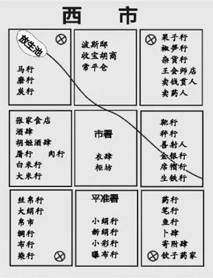 西市是这个样子的,是一个方形,被井字街分成了九块。里边有卖鱼的、卖米的、卖金银器的,所有的商铺都罗列在这个井字街的两边。