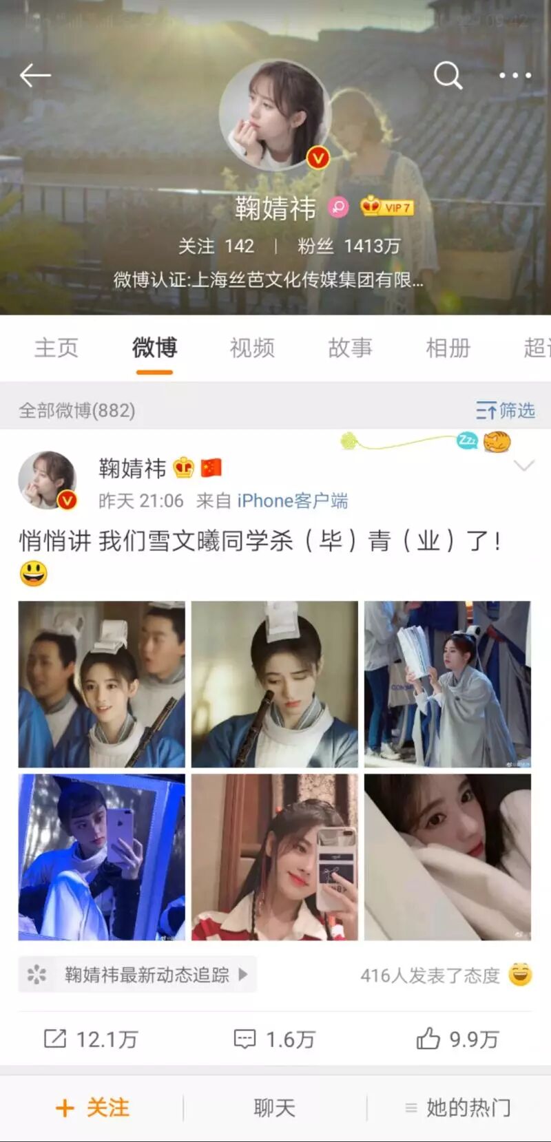 虽然前有限古令,但古装剧近期依然很受欢迎,比如热播的《长安十二时辰》、《陈情令》就取得了不错的成绩。鞠婧祎、宋威龙主演的《云上学堂》近日在象山杀青,鞠婧祎在微博晒出自己男扮女装的剧照,尽显眉清目秀、俊美非凡,宛如翩翩公子。