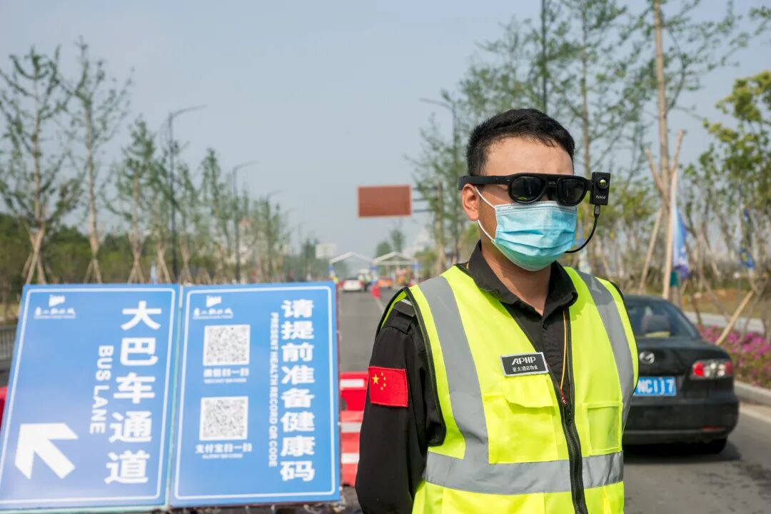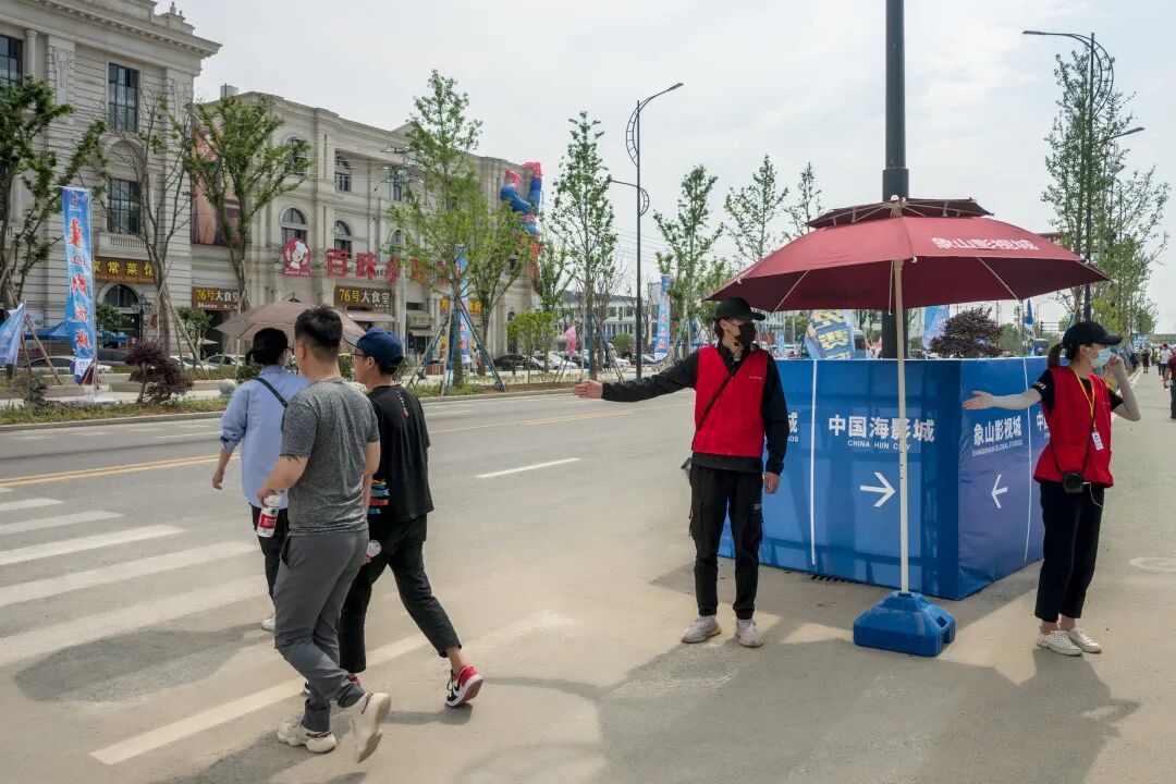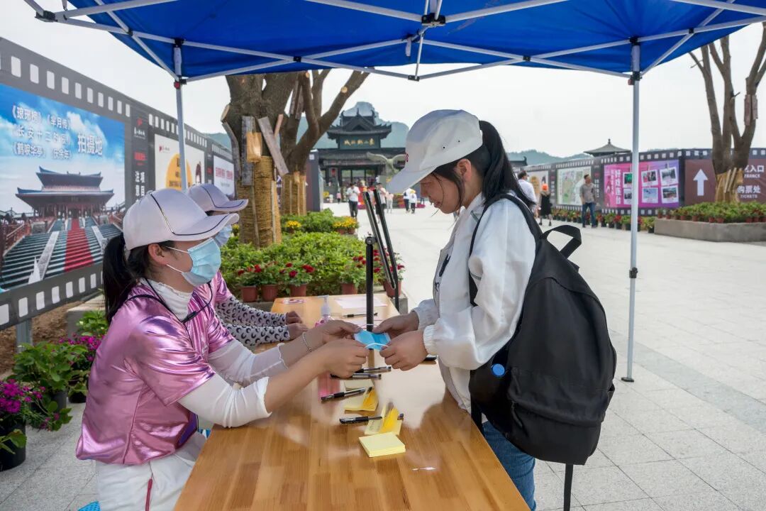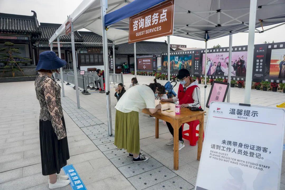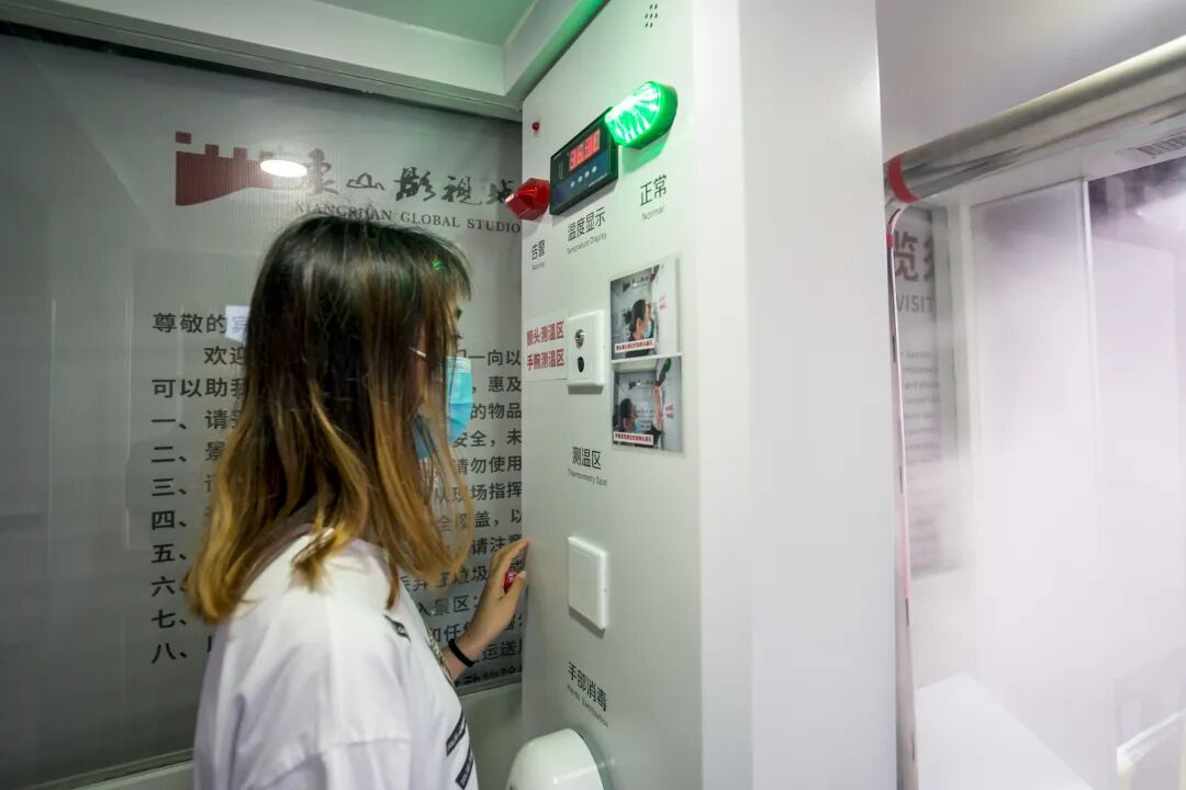 焕然一新的景区外广场于五一“火线上岗”,为提升游客的游玩体验度,景区在外广场、影视大道、星光广场等地增设10个咨询服务点。象山影视城将亮码+测温关口前移至影视大道,确保游客安全有序入城游玩,引导咨询人员配备智能测温AR眼镜可通过眼镜的红外测温和识别,采用AI智能算法和多点均值拟合测温技术对周围人群体温进行实时监测和有效预警。景区入口处设有智能防疫一体机,游客进入机器即可实现自动感应全方位雾化消毒、准确判断是否存在体温异常等;游览车座椅上有“请间隔乘坐”字样,景区各设施场所都贴有“本区域已消毒”等提示,为游客安全游玩提供保障。
