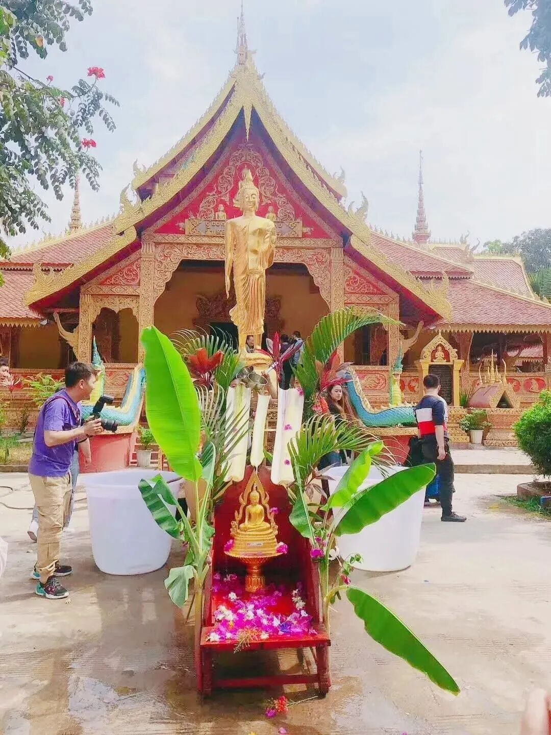 每到泼水节,傣族男女老少将穿上节日盛装,挑着清水去到佛寺浴佛,然后开始相互泼水,一朵朵水花在空中盛开,它象征着吉祥、幸福、健康。活动期间象山影视城还将举办浴佛祈福,寓意用水祈求洗去尘埃,重新迈向新生活。
