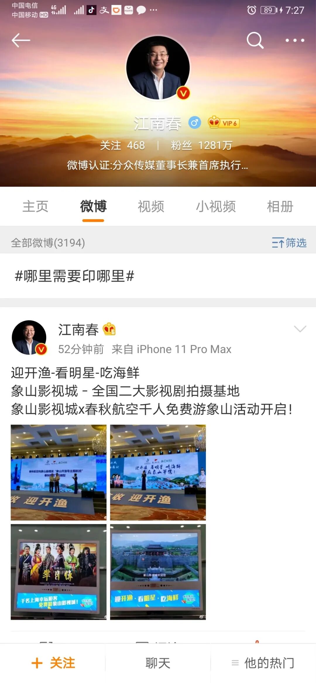 分众传媒创始人江南春亲临推介会现场,与媒体进行互动,并在新浪微博推荐各位小伙伴来象山迎“开渔”、看明星、吃海鲜。开启上海千人免费游象山影视城活动。