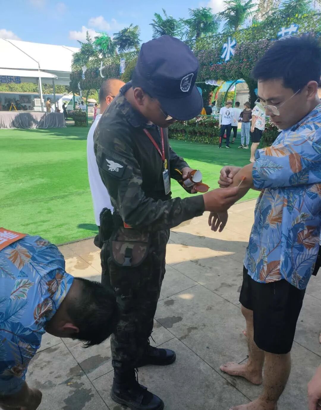 烈日下,景区安保人员依然身着整齐的制服,站岗、执勤,如火骄阳并没有吓退他们前进的步伐,汗水湿透的衣衫并没有打乱他们巡逻的脚步,他们时刻尽职尽责,没有丝毫松懈,耐心引导车辆、人群,认真排查安全隐患,全力保障景区运营安全。