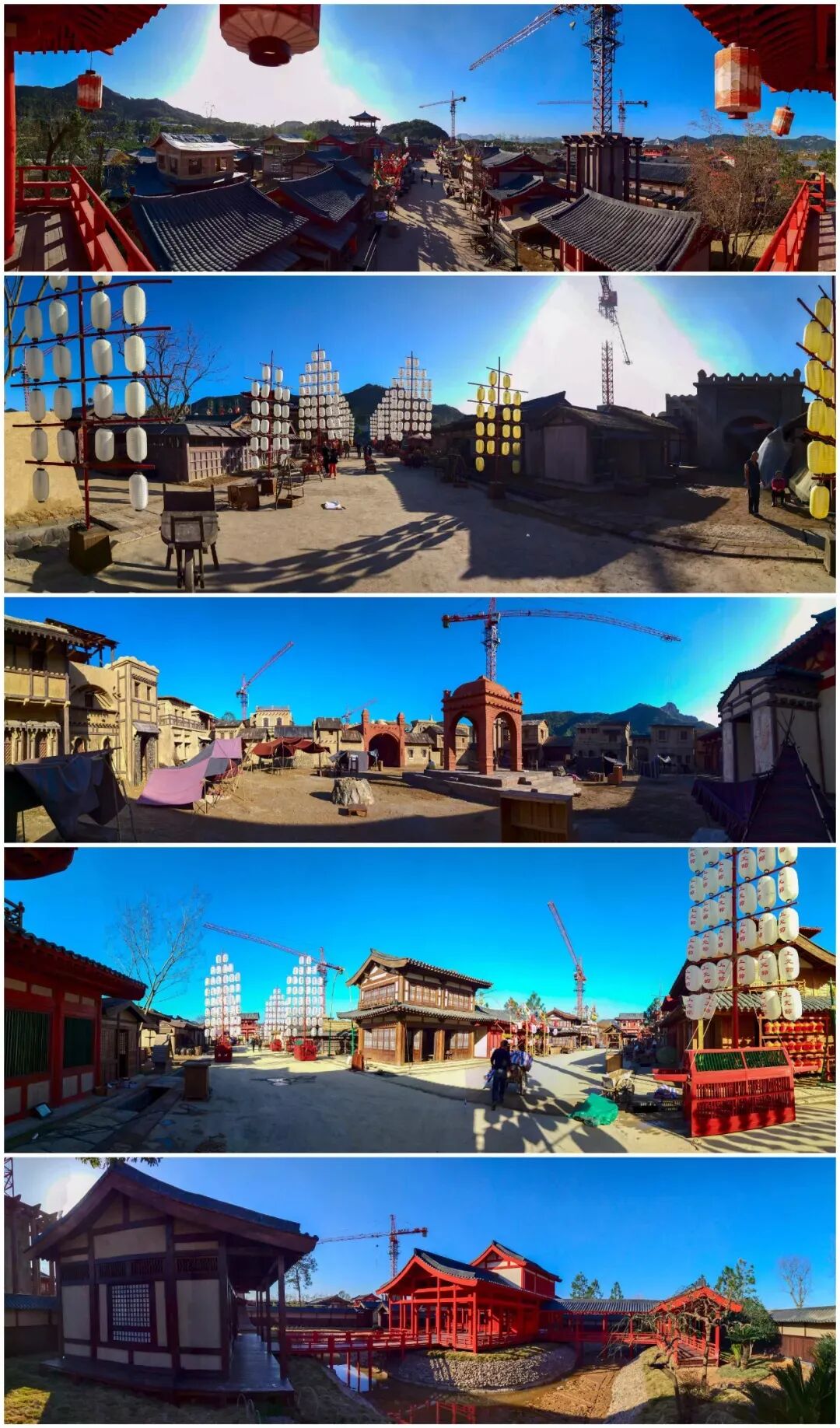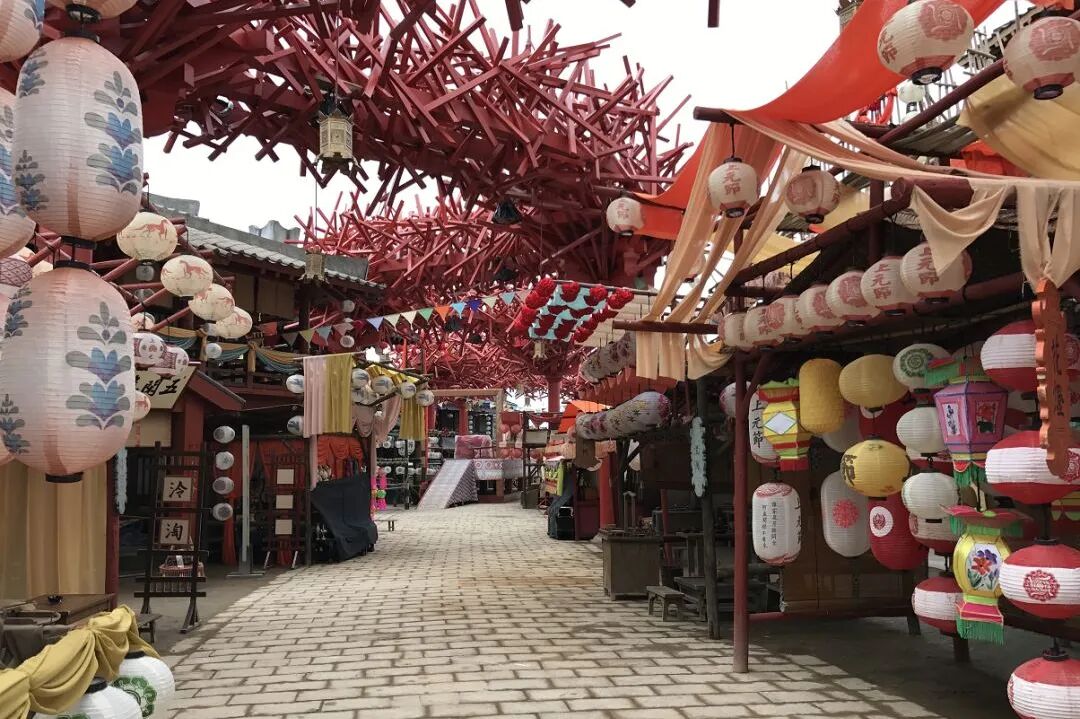 唐城建于象山影视城原陆家庄区域,由《长安十二时辰》剧组自行设计与象山影视城合作总投资5000万元,占地71.22亩,由65幢唐代典型建筑组合而成,包括景教、万泉宅、霍寨、街道、古代坊墙等,气魄宏伟、庄重大方,再现“九重城阙”和“千乘万骑”的磅礴气势,集中展示了唐朝强盛时期的社会风貌和时代精神。